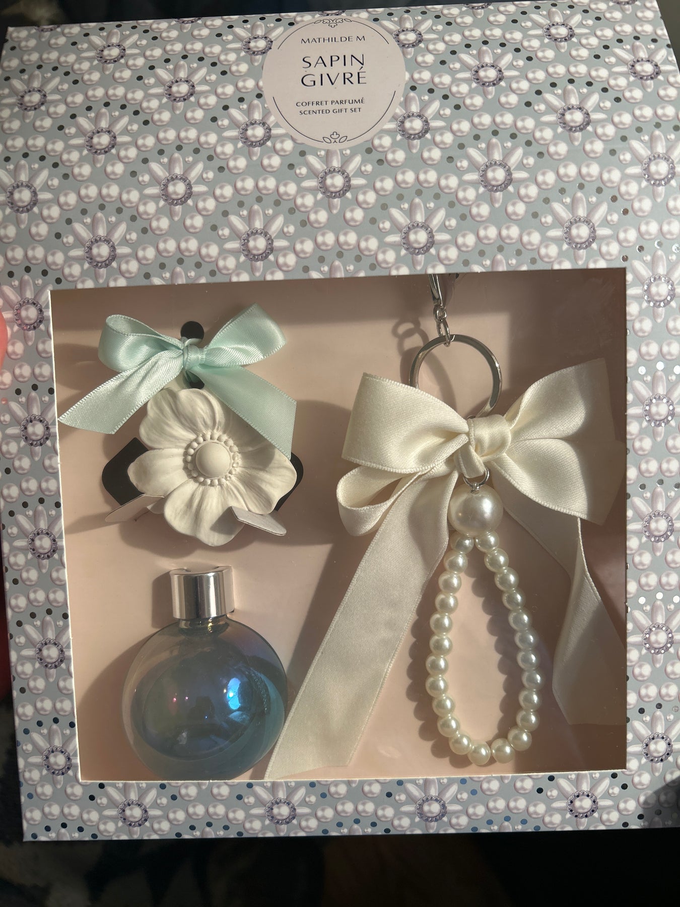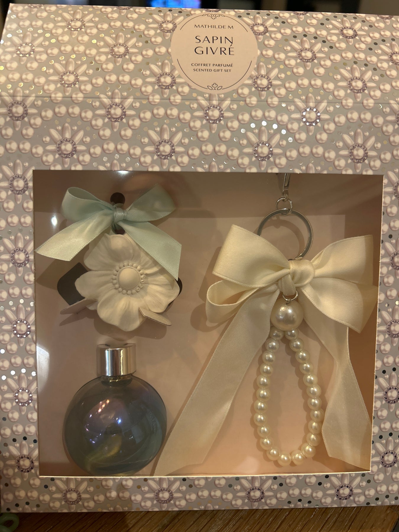 Scented gift box including, reed diffuser, scented plaster decoration for wardrobes or drawers and pearl and ribbon keyring