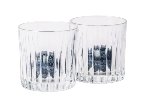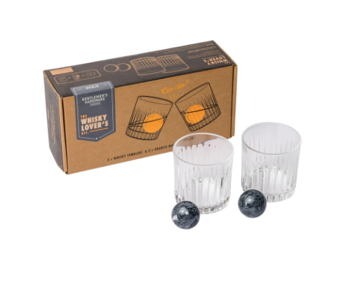 Includes: (2) Twin Tumbler Glasses and (2) Granite Spherical Whiskey Stones