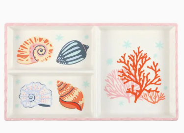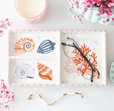 Keep your essentials in shipshape order with this ceramic trinket tray, decorated with cheerful shells and coral in a palette of soft beachy tones. With three handy sections, it's ideal for sorting jewellery, glasses, or other shiny treasures in your mermaid hideaway.