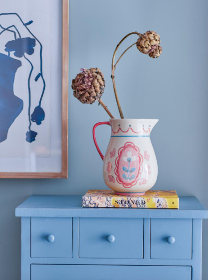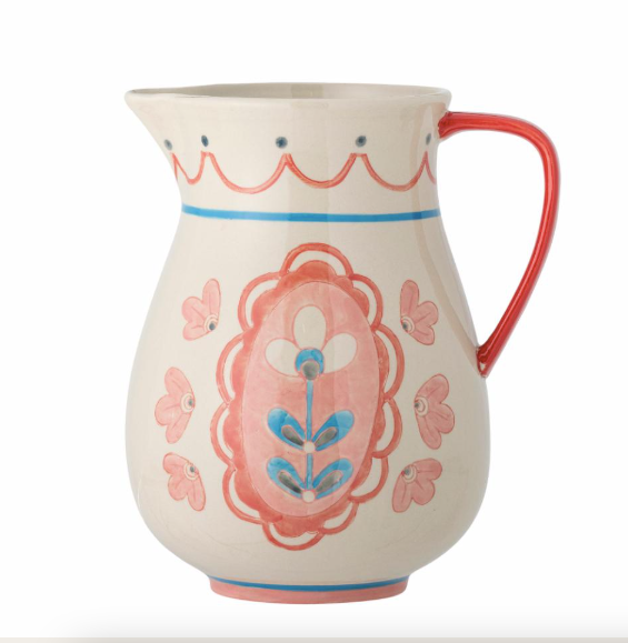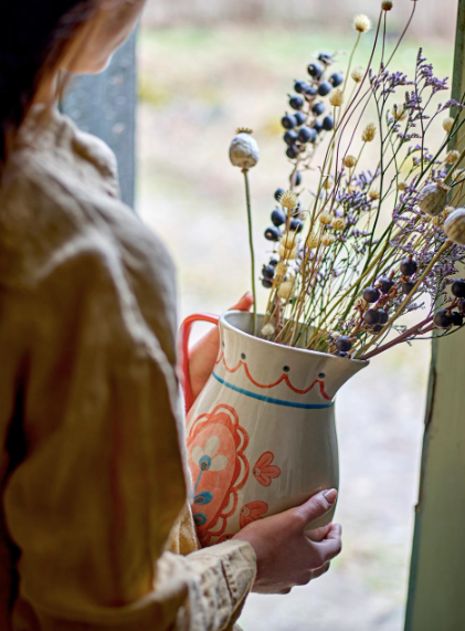 The Odina Jug by Bloomingville presents a neutral background, which elegantly highlights the charming floral motif in shades of pink and blue. The handle in a deep pink shade offers a striking contrast, enriching the pitcher's gentle appearance with a modern twist that complements its nostalgic aesthetics.