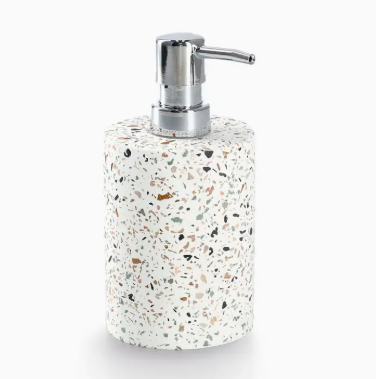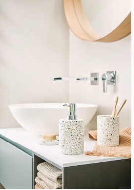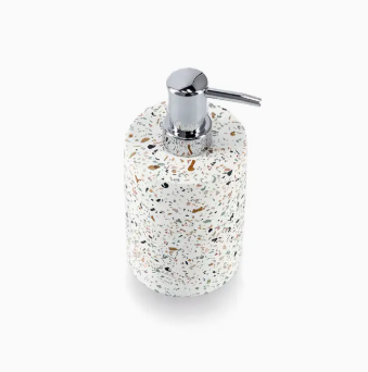 With the Zeller soap dispenser in terrazzo style, you will enjoy washing your hands. The dispenser, made of high-quality cement, can be operated with a simple pump mechanism and filled with all standard liquid soaps. The toilet brush, toothbrush cup, and soap dish complete the "Terrazzo" series.
