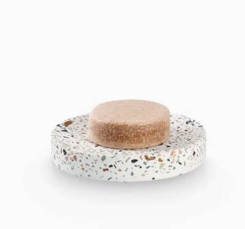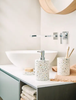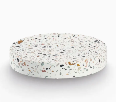 Stylishly stored - with our cement soap dish in an elegant terrazzo pattern, you always have a chic eye-catcher in the bathroom and at the same time a fixed place for your bar of soap. The terrazzo style is reflected in a complete bathroom series, allowing you to furnish your bathroom uniformly.
