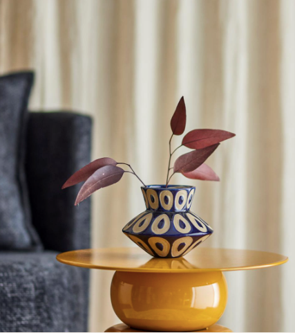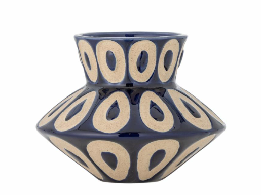 The Bashir Vase by Bloomingville is a stoneware vase with a distinctive sculptural silhouette, featuring a narrow top and bottom contrasted by a wider midsection. It is finished with a glossy blue waxed glaze and decorated with beige oval motifs. Small variations in pattern and colour intensity may occur, making each vase unique.