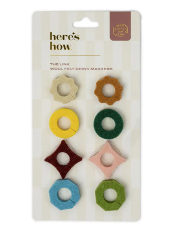The Link Drink Tags are made from durable felt in a variety of shapes and colors, designed to help you easily identify your drink. A simple, practical solution to avoid mix-ups at any gathering.