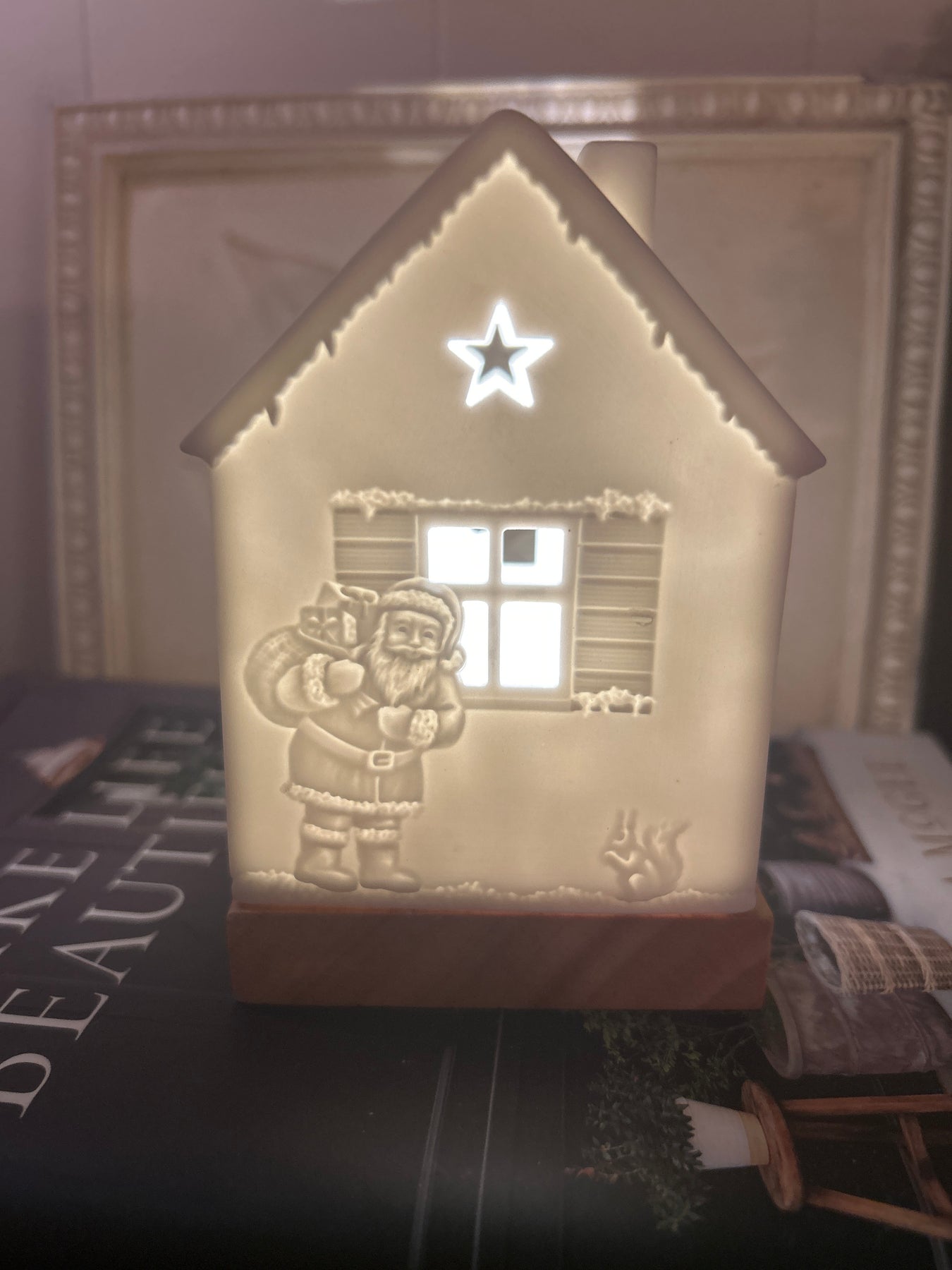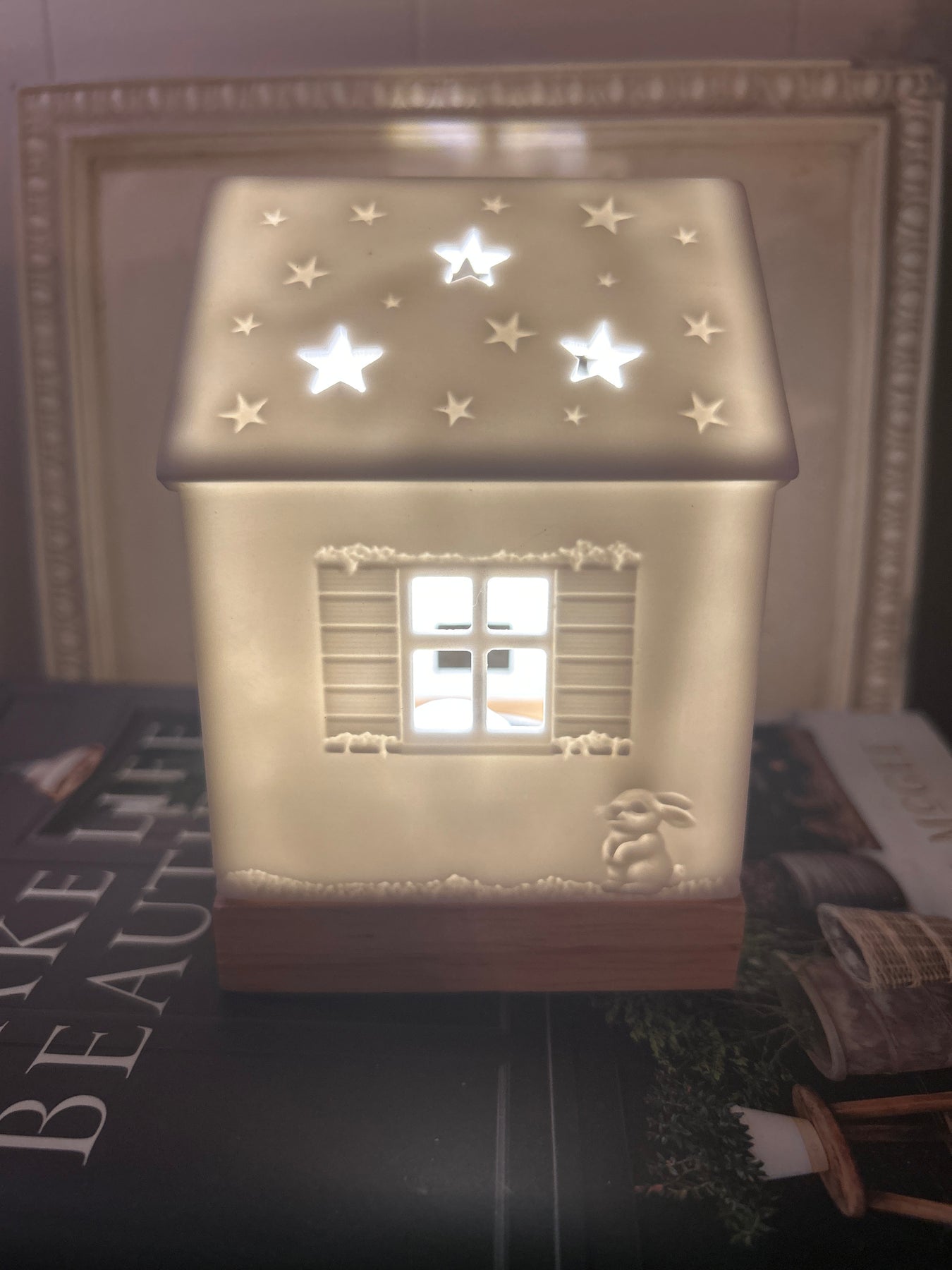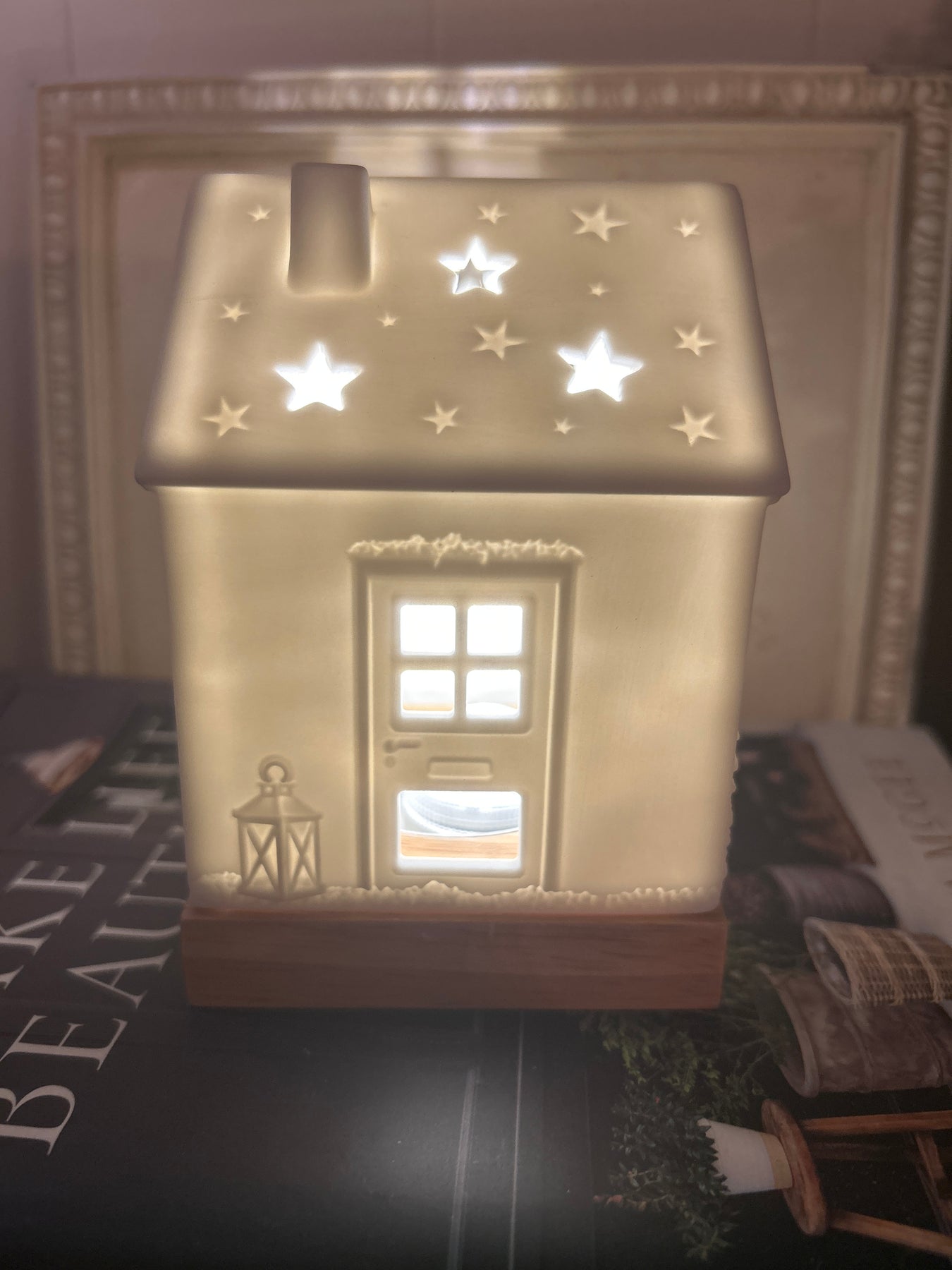 Porcelain with wooden base. Use an led tealight or tealight